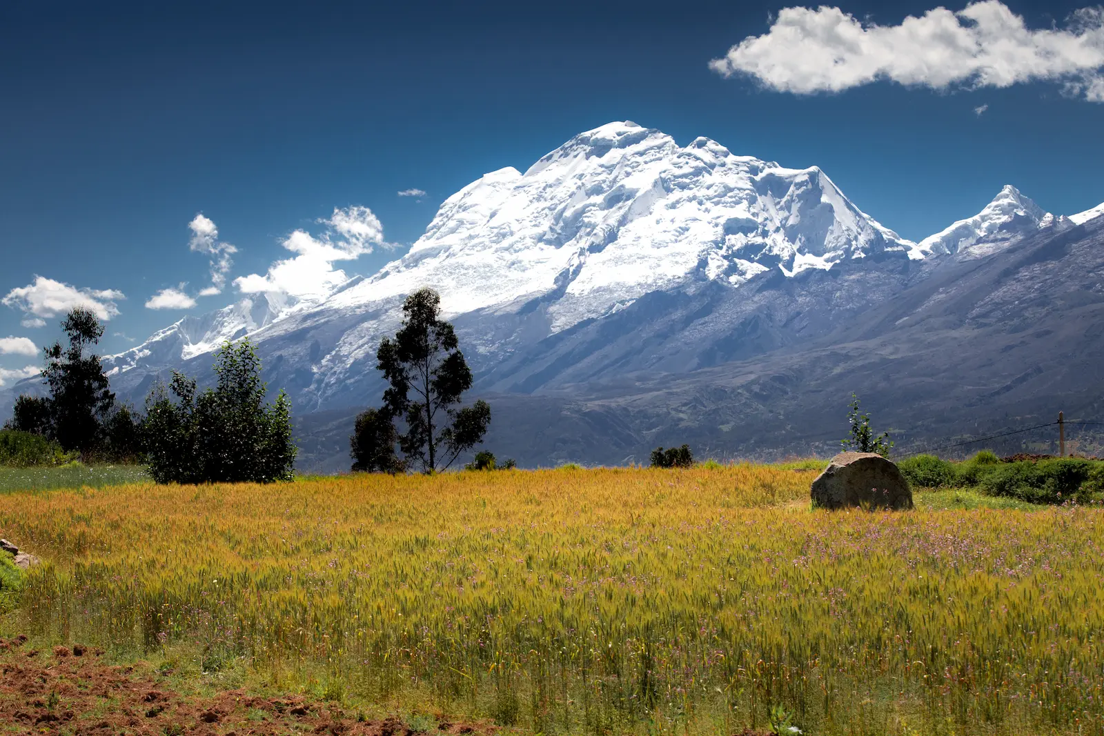 Après le petit-déjeuner, nous partons pour ce qui est certainement l’une des plus belles étapes de notre trek autour de l’Alpamayo. La journée débute par une déambulation bucolique à travers les hameaux et les champs cultivés de cette région agricole. Bientôt, le chemin prend de l’altitude et rejoint une large crête herbeuse qui se dresse parallèlement à la Cordillère Blanche. Nous en suivons les ondulations (altitude maximale vers 4200 m) jusqu’à notre campement, profitant au passage de panoramas grandioses sobre le versant Est de la cordillère ; de nombreux sommets dépassant les 6000 mètres sont dominés por l’imposant massif du Huascaran (6768 m). Nous installons notre campement en contrebas de la crête, à proximité des ruines de Yaino.