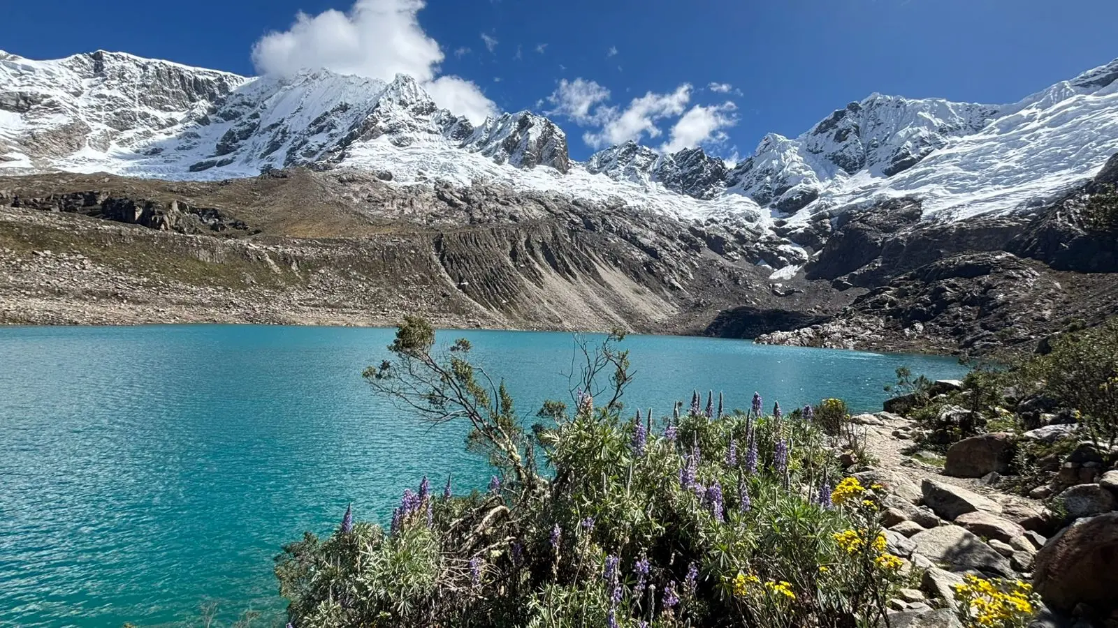Le sentier suit d’abord la rive gauche du lac Huecrococha. A flanc de montagne, nous contournons ensuite un vaste pâturage marécageux, por un chemin en montagnes russes. La pente se redresse en atteignant le fond de la vallée ; l’ambiance des lieux redevient alpine. Tout en grimpant, le chemin nous dévoile peu à peu un panorama magnifique sobre des sommets glaciaires surplombant une belle lagune verte. Le sentier atteint le col Alto de Pucaraju (4610 m), étroite brèche entre deux sommets de plus de 5000 mètres, le Taulliraju et le Pucaraju. Du col, nous profitons alors de l’une des plus belles vues de la Cordillère Blanche; nous sommes face au Paron (5600 m), au Chacraraju (6112 m) et à bien d’autres cimes élégantes. Une descente courte mais raide nous permet de rejoindre le chemin classique emprunté par les trekkeurs arrivant de Cashapampa. Poursuite dans la vallée verdoyante de Huaripampa que nous descendonc tranquillement jusqu’au hameau éponyme, situé à 3600 m.